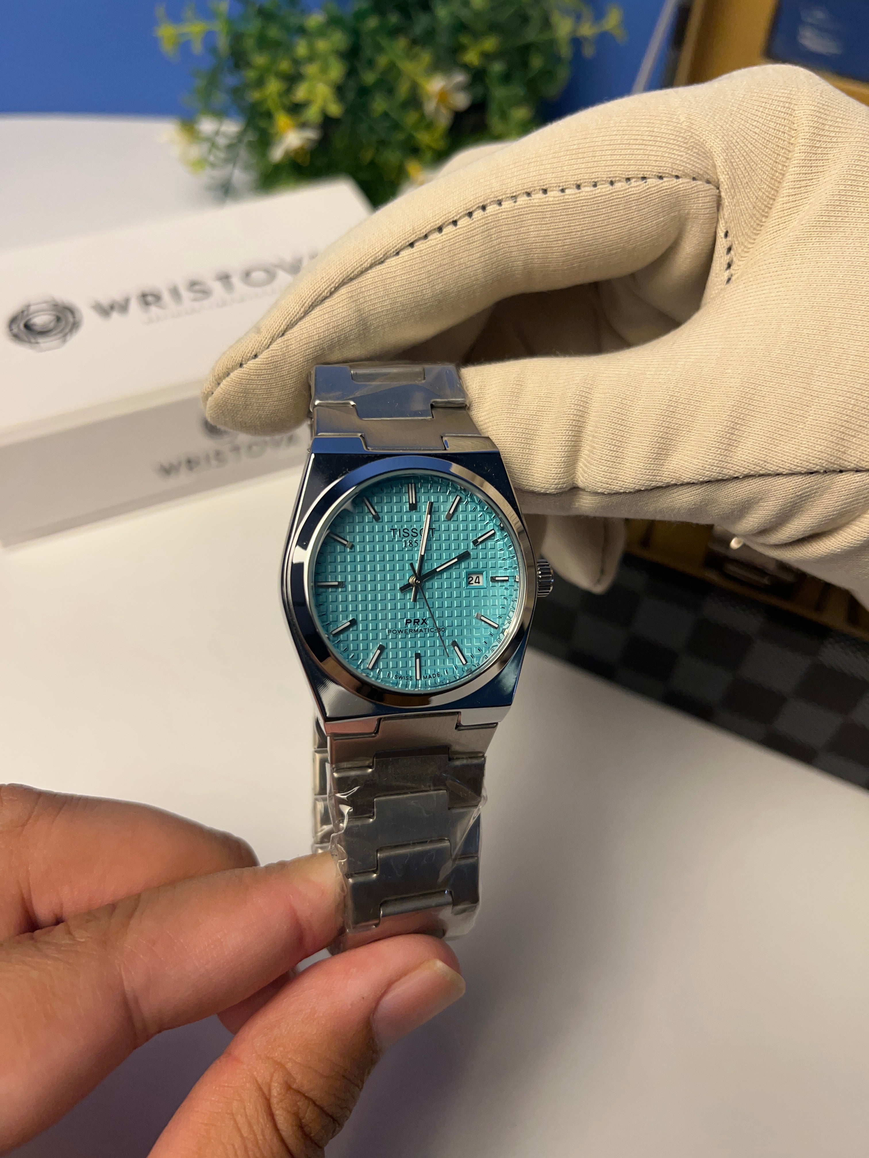 Experience luxury and style with the TISSOT PRX POWERMATIC Ice Blue Watch. Featuring an elegant ice blue Tiffany dial and a sleek silver steel strap, this watch combines modern design with high-quality craftsmanship.